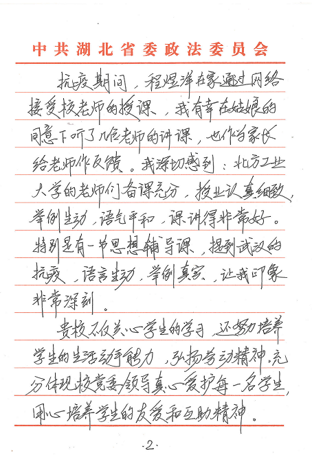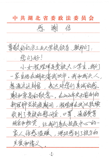 “小女程煜洋是贵校大二学生。我们一家生活在湖北省武汉市。我和我的夫人,想通过这封信,对您们表达真诚的感谢和崇高的敬意。在2020年史无前例的新冠肺炎抗疫期间,程煜洋陆续收到了贵校的慰问金、口罩、通信费等现金和物资,让我们身处抗疫中心的一家人倍感温暖,深切感到校方的关爱和情义……”。这是4月3日信息学院辅导员杨和家收到的一封来自通信18-3班程煜洋同学家长的感谢信,全文600余字,饱含了身处武汉抗疫中心的一家人对学校学院在疫情期间给予关心关爱的深切感激之情。