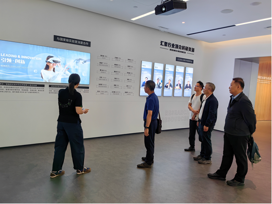 活动的第一部分是参观调研国家虚拟现实创新中心。与会人员详细了解了中心在虚拟现实技术研发、创新应用等方面的最新成果及发展规划。接着,严小天总经理介绍了国创中心的主要情况,强调了虚拟现实产业未来的巨大潜力和技术前沿。李晓波副总经理则分享了虚拟现实技术在各行业的应用前景,并展示了中心在推动虚拟现实产业创新方面的成就。随后,pg娱乐电子游戏官网入口智能学院的马礼书记代表学院介绍了在虚拟现实领域的教学和科研进展,展示了学院在数字媒体技术和虚拟现实技术融合方面的最新成果。