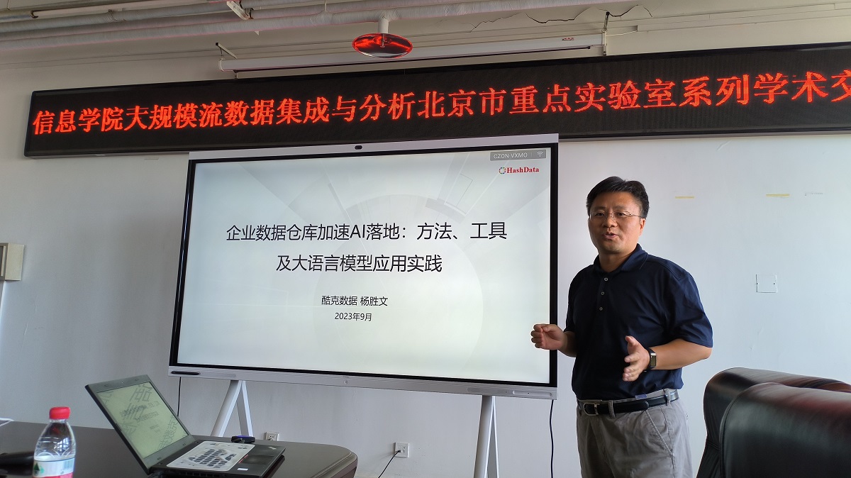 2023年9月20日上午,信息学院大规模流数据集成与分析技术北京市重点实验室邀请了酷克数据首席科学家杨胜文博士进行了题为“企业数据仓库加速AI落地:方法、工具及大语言模型应用实践”的学术报告和交流。本次报告由实验室的王桂玲研究员主持,实验室主任韩燕波教授代表实验室师生对杨胜文博士表示了热烈的欢迎,信息学院七十多位同学参加了此次学术活动。